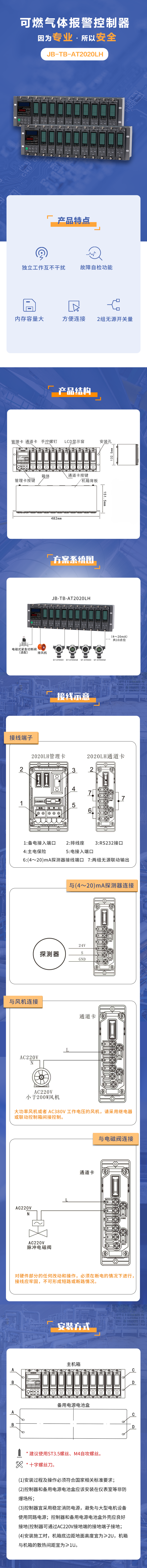 JB-TB-AT2020LH可燃气体报警控制器是由探测器与控制器组成的工业及商业用气安全监测系统的监控设备。将探测器安装于可能存在被测气体泄漏的危险场所;控制器安装在非防爆区域(控制室内)。当监测环境中有目标气体泄漏或液体挥发时,探测器经过识别、分析并将目标气体浓度转换为4~20mA 信号发送给气体报警控制器,控制器接收处理后显示出被测气体浓度。当被测气体浓度达到或超过报警限值时,控制器将发出声光报警信号,并根据联动关系输出外控信号,启动相应被控设备,从而有效的保障安全生产、生活和预防气体大量泄漏带来的危险事故的发生。